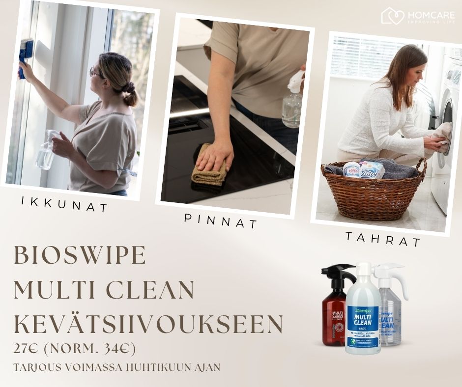 BioSwipe Multi Clean on koko kodin yleispuhdistusainetiiviste, joka on tehokas, mutta turvallinen niin käyttäjälle, pinnoille kuin ympäristöllekin. Se on myös erittäin riittoisa. Se laimennetaan vedellä ja yksi iivistepullo riittää 31 sumutinpullolliseen.