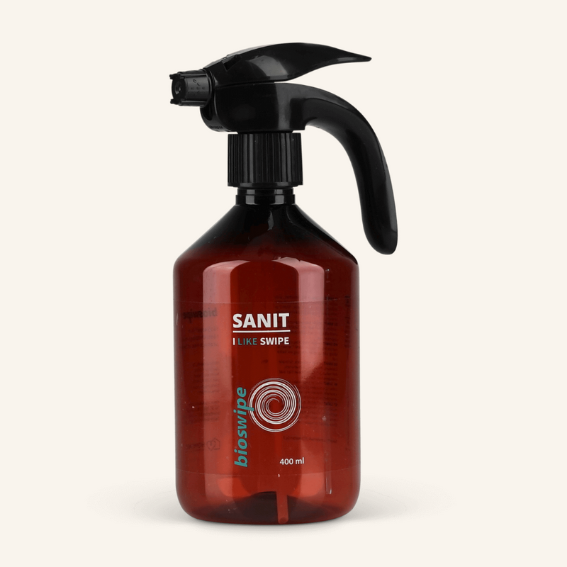 Tyhjä ruskean värinen sumutinpullo BioSwipe Sanit-laimennukselle, laimennussuhde 1 osa tiivistettä + 9 osaa vettä.
