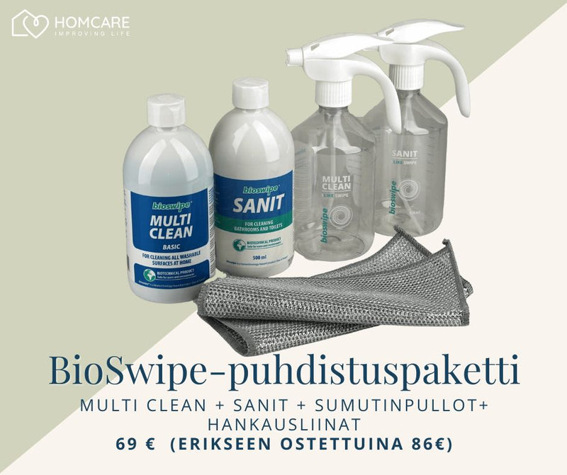 Tällä monipuolisella BioSwipe-siivouspaketilla puhdistat koko kodin pintojen lisäksi myös kylpyhuoneen ja saniteettitilat – tehokkaasti, mutta turvallisesti. Paketti sisältää kaikki tarvittavat tuotteet kodin puhtaanapitoon sekä kätevät siivousliinat vaikeimpienkin tahrojen poistoon.